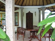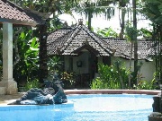 De villa is gebouwd in traditionele Balinese stijl. De ingang is naast een prachtige 200 jarige Beringin-boom met een boeddhistisch tempeltje. Als je door de kleine Balinese deur binnengaat, bevind je zich in een mooie tuin, gebouwd rond een romantisch zwembad (15 x 6) met ligterras en zit pagode. De vier bungalows liggen discreet rond het zwembad.Al de bungalows zijn volledig gemeubeld met airco, fan en een eigen badkamer. Aan de achterkant bevindt zich de hoofdvilla en de drie suites. Deze nieuwbouw bevat drie luxueuze suites op de eerste verdieping. De suites hebben marmeren vloer en zijn uitgerust met prachtige meubels. Ze hebben een buitenterras met mooi panorama over de rijstvelden en het complex. Elke suite heeft een volledig uitgerichte slaap- en badkamer, met airco, sofa en TV.