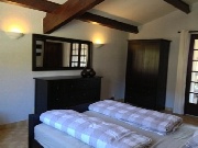 | Je komt binnen in een grote woonkeuken, van waaruit je de badkamer in kunt lopen, met wastafel, regendouche, bad en toilet. Door een toog loop je de gezellige woonkamer in met een gevulde boekenkast (boeken, DVD's en spelletjes), een chaisse longue en heerlijke kuipstoelen. Vervolgens loop je door de 2-persoons-slaapkamer in op de begane grond, met een eigen wastafelmeubel. De veranda en het terras zijn vanuit alle vertrekken te bereiken. Via de trap in de grote woonkeuken, kom je op de 1e etage met een slaapkamer met stapelbed, als ook een babybedje. Zelfs aan een aankleedkussen is gedacht. Tenslotte de Master bedroom met enorm veel (berg)ruimte en een balkon met een schitterend uitzicht richting Darbres en de heuvels van het plateau de Coiron. |